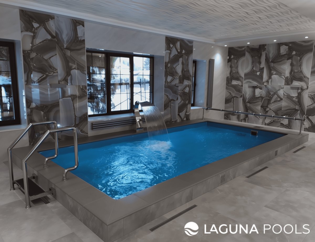 Прямоугольный бассейн с металлическими поручнями и лестницей в помещении с плиткой под камень.